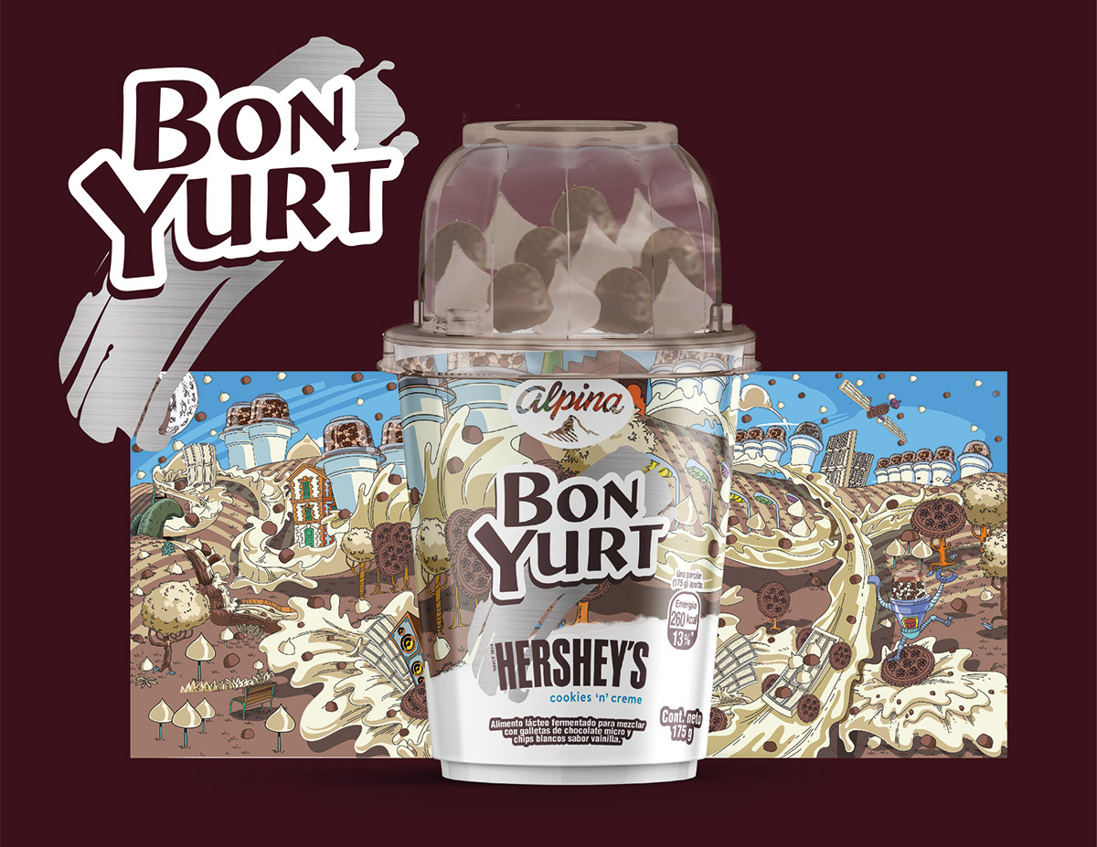 In collaboration with an illustrator, I developed this limited-edition label for Hershey’s + Bonyurt, a product by Alpina Colombia. The design had to perfectly balance indulgence while bringing to life the concept behind the phrase "Un mundo diferente" (A different world).
